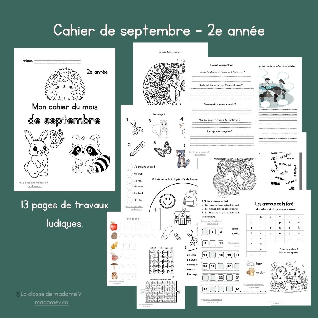 Voici mon cahier de septembre, sous le thème de la forêt. On y travaille beaucoup la lecture et l’écriture.