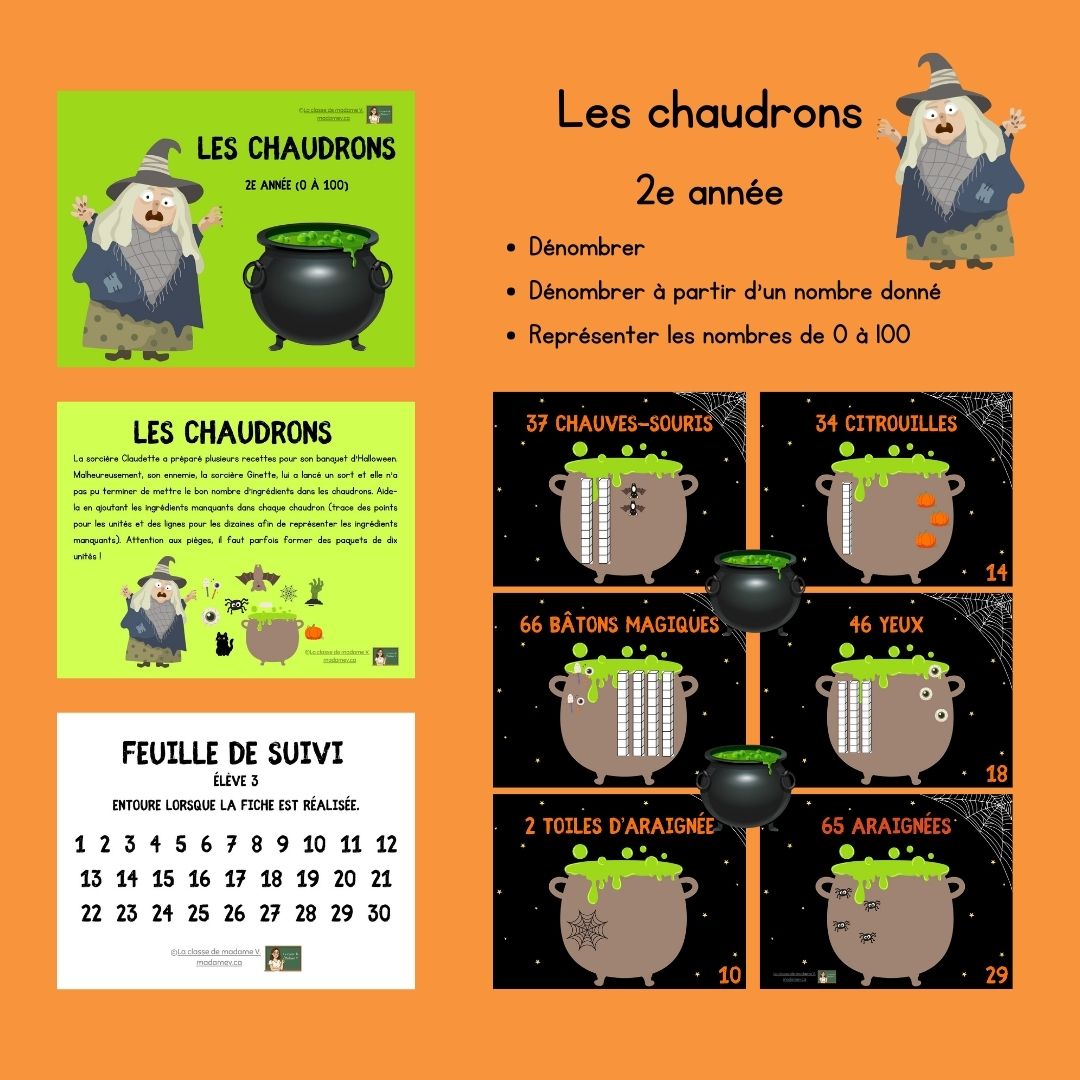 La sorcière Gilberte a préparé plusieurs recettes pour son banquet d’Halloween. Malheureusement, son ennemie, la sorcière Albertine, lui a lancé un sort et elle n’a pas pu terminer de mettre le bon nombre d’ingrédients dans les chaudrons. Aide-la en ajoutant les ingrédients manquants dans chaque chaudron (trace des points pour représenter les ingrédients manquants).